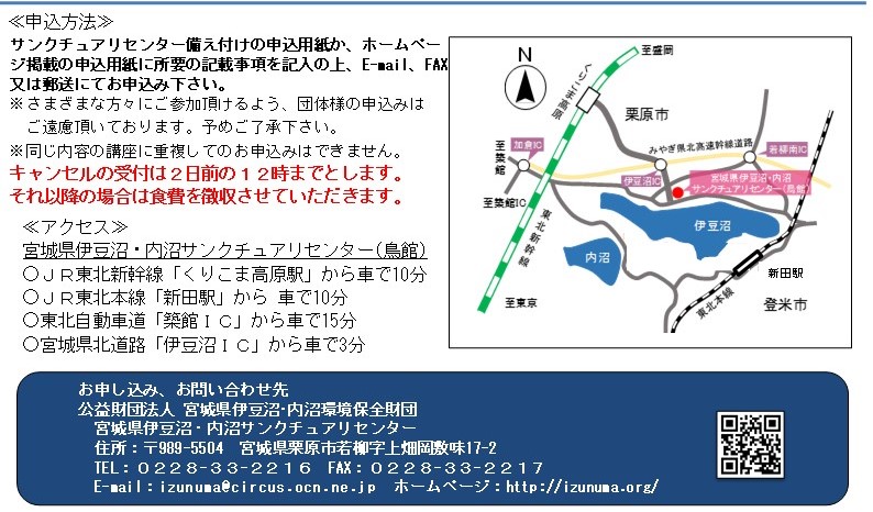 | ≪自然体験講座申込書≫ | お申込み、お問合わせ先: 宮城県伊豆沼・内沼サンクチュアリセンター 住所:〒989-5504 宮城県栗原市若柳字上畑岡敷味17-2 TEL:0228-33-2216 FAX:0228-33-2217 E-mail:izunuma@circus.ocn.ne.jp ホームページ:http://izunuma.org/ |