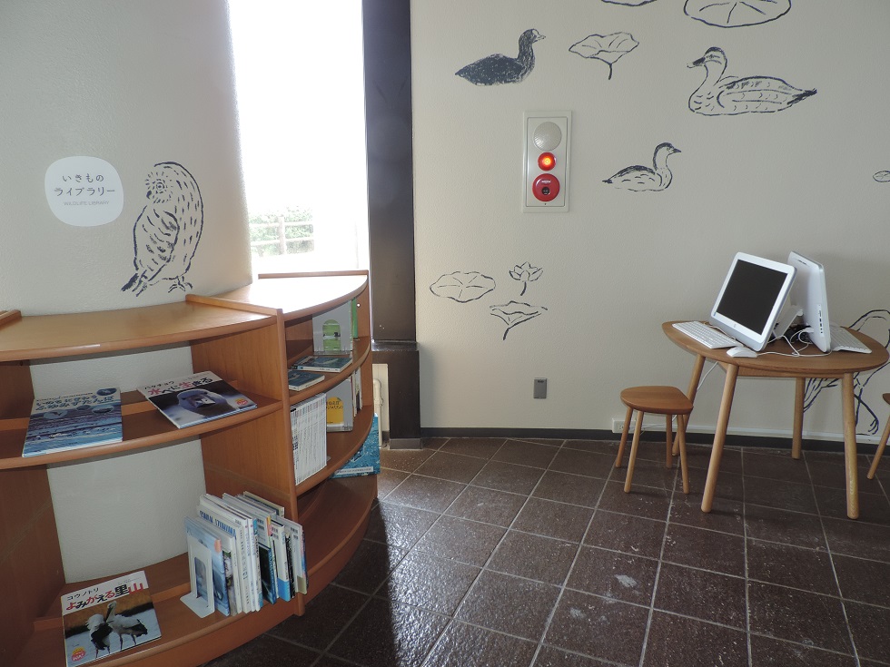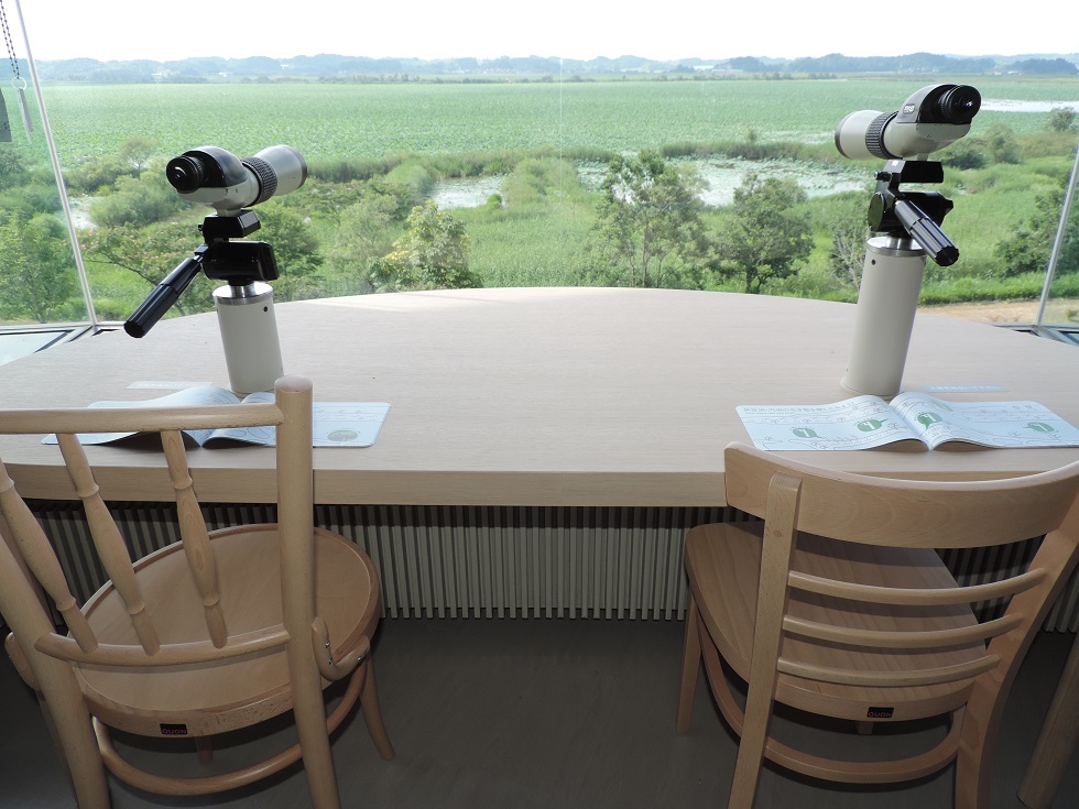 | 2階ビューラウンジには望遠鏡があり、座ってゆっくり沼の自然を観察できるよう、机に取り付けられ、イスが設置されています。 | ||||||||||