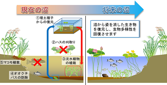 | 伊豆沼・内沼では、水質悪化や生物相の単純化、外来生物の増加などの問題があり、昔の豊かな沼の自然を取り戻す必要性が生じたことから、平成21年度より伊豆沼・内沼自然再生事業(宮城県HP)が行われています。事業の内容は、水生植物の復元や魚貝類の増殖、流入負荷の低減、浅底化の防止などがあります。 |