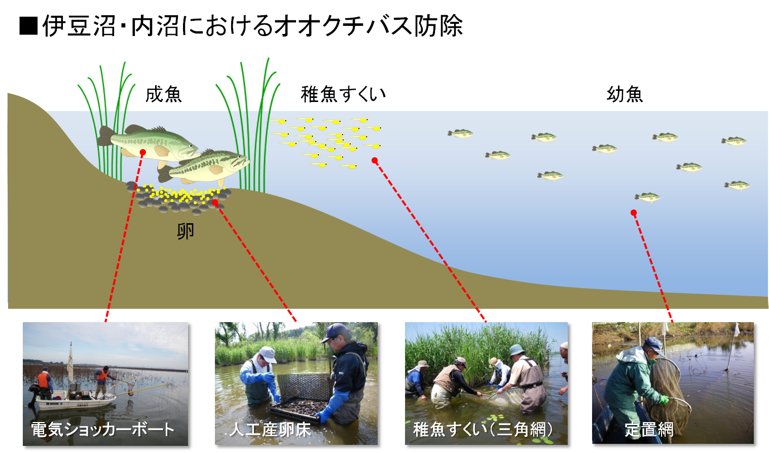 伊豆沼方式のブラックバス駆除の取組みでは、ブラックバスの生活史に合わせた方法で駆除を行うことによって、ブラックバスの増殖を総合的に抑制することを目的としています。 |