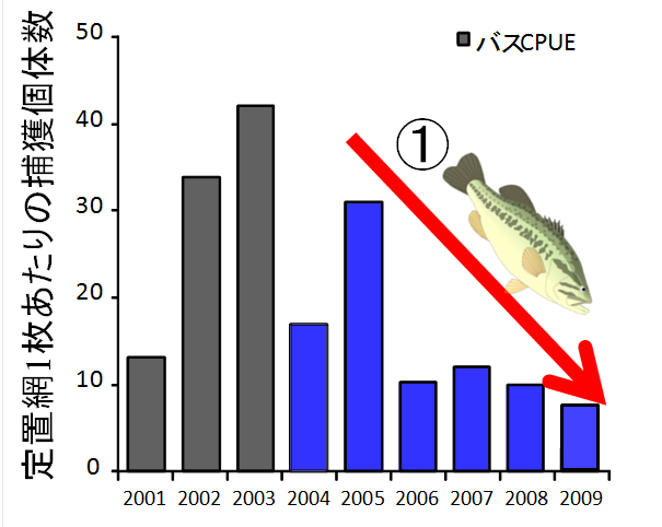 | 伊豆沼では、2004年に結成されたバス・バスターズにより、人工産卵床を用いた卵の駆除と卵を守る親の駆除、そして、三角網を用いた稚魚の駆除を行ってきました。バス・バスターズによるブラックバスの繁殖抑制活動を始めてから、ブラックバスの捕獲数は年々減少傾向にあります。