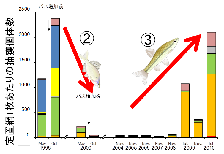 | 以上のように、伊豆沼・内沼では、ブラックバスの生活史に合わせて、さまざまな方法で駆除に取り組んできた結果、近年ではブラックバスがピーク時の数分の1に減少し(下図@)、ブラックバスによって大きく減少していた(下図A)伊豆沼・内沼の魚類も、最近、回復し始めています(下図B)。 | ||
