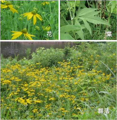 オオハンゴンソウは、北アメリカ原産のキク科の多年草です。草丈は1〜3mになる植物で、7〜10月に黄色い花を咲かせます。湿った土がある場所を好みますが、道路の法面などにも生育します。 |