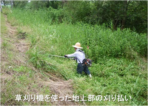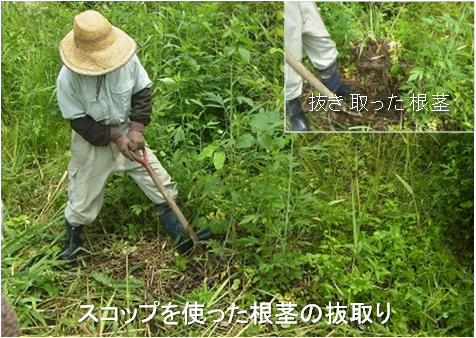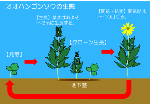 オオハンゴンソウは、種だけでなく地下茎をのばしてクローン成長をするため、繁殖力が非常に旺盛です(右図)。地上部を取り除いても、地中に地下茎が残っていると、地下茎から再び発芽することができます。そのため、駆除方法としては、地下茎から抜きとる方法が有効です。また、草刈り機を用いて地上部を除去する場合には、繰り返し駆除することで、群落の拡大を防ぐことができます。 |
