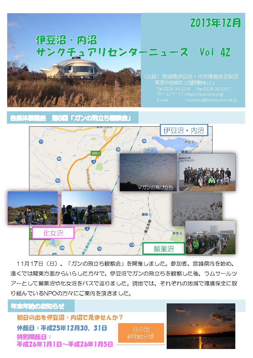 | 伊豆沼・内沼の環境保全をすすめていくためには、地元の方の協力が必要です。財団で行っている環境保全活動を知っていただくため、月1回センターニュースを発行し、地域に配布しています。 | ![]() |