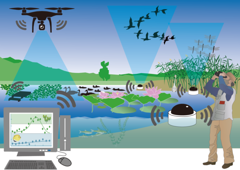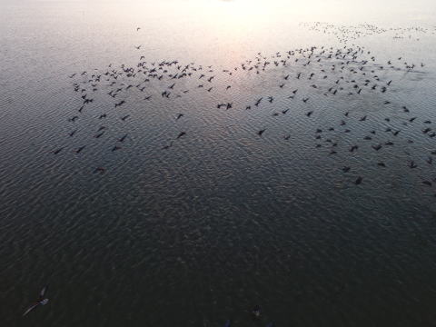 自然再生など生態系を管理する上で生物相をモニタリングすることは不可欠です。近年注目を集めるUAV(無人航空機、通称ドローン)は、調査の効率化や多時期の情報取得により、フィールドワークや衛星画像解析といった従来のモニタリング手法を補完できる可能性があります。湿地の水鳥調査では、ドローンは空中から水鳥を容易に撮影できるため、これまで地上から人が判別していた種やその個体数の把握を効率化・省力化できる可能性があります。私たちは、ドローンを用いた水鳥のモニタリング手法を開発するため、モニタリングに必要な画像精度の検討や画像の自動分類手法の検討を行っています。