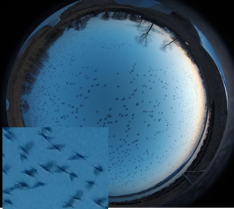 従来、マガンをはじめとする渡り鳥の飛来数の把握は、目視によるカウントが一般的でした。しかし目視によるカウントは、労力と時間のコスト高、調査に従事する人材の確保、調査者の熟練度の違いによるカウント結果のばらつきといった課題もありました。こうした課題を打開する方法として、現地設置型の監視カメラの使用が挙げられます。私たちは、現地設置型のカメラによるマガン監視法を確立するため、遠隔での操作・データ取得が可能な監視システムと、それを用いて得た画像の解析によるマガン個体数推定法を開発しています。